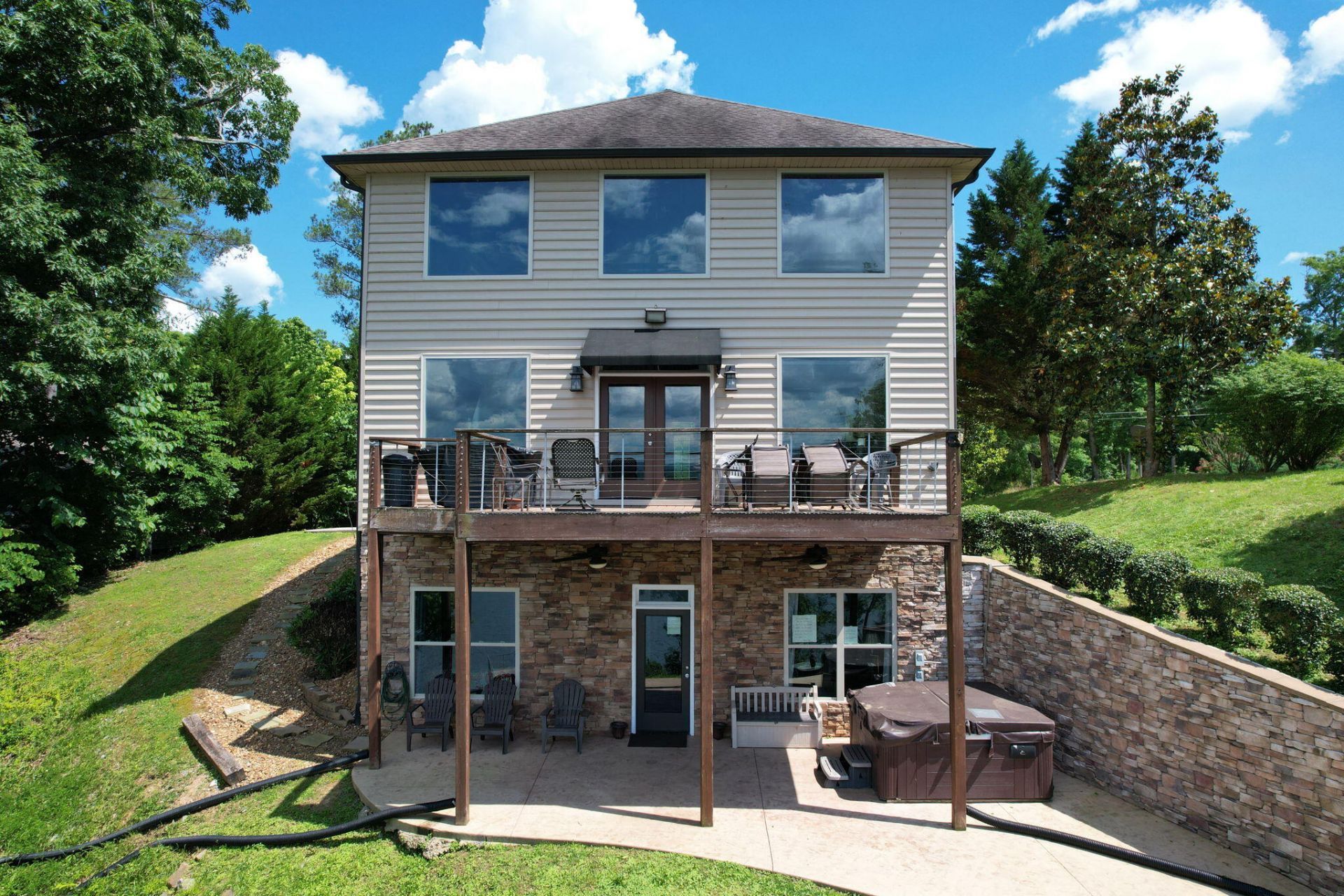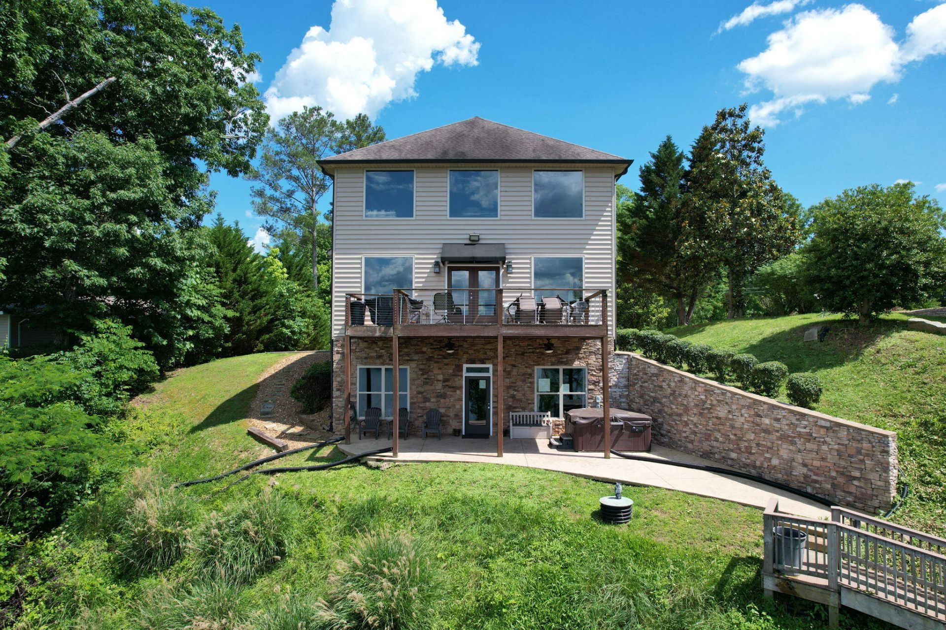 Discover the ultimate waterfront living experience in this exquisite modern home, perfectly situated on the banks of the Tennessee River (Chickamauga Lake). Boasting 4 rooms and 4.5 bathrooms, this property offers unparalleled luxury, comfort, and breathtaking river views from the main living area of the home. The open floor plan seamlessly integrates the living, dining, and kitchen areas, all highlighted by large windows that frame stunning river views and flood the space with natural light. The kitchen is equipped with stainless steel appliances, sleek countertops, a large island with seating, and ample storage, making it ideal for everyday cooking and entertaining. There is also the convenience of a master bedroom and laundry room located on the main level. Upstairs you will find two large rooms currently set up with double full beds in each room. One room has an en-suite bath and walk in closet while the other room has access to the full bathroom located in the hallway. The walkout basement is designed for entertaining, complete with a bar, spacious living area, an extra multi-use room, full bath and additional storage room. The private dock is just down the steps where you will find a large bi-level dock with two boat slips with lifts. Experience the perfect blend of comfort and practicality while enjoying all the TN river has to offer. This gorgeous home could be used as a primary residence, a summer home, or as a short-term rental investment. Call to schedule a private tour today!