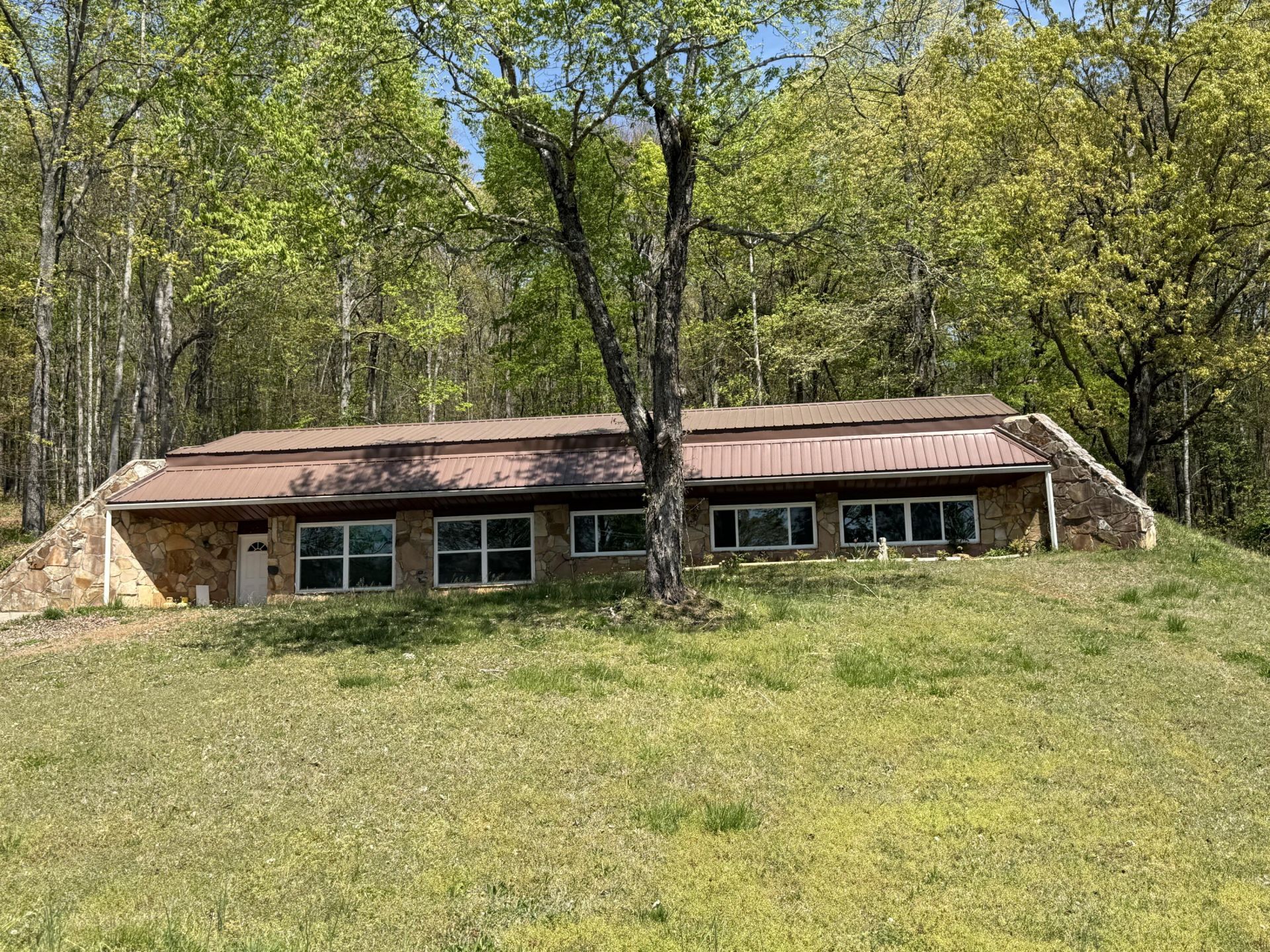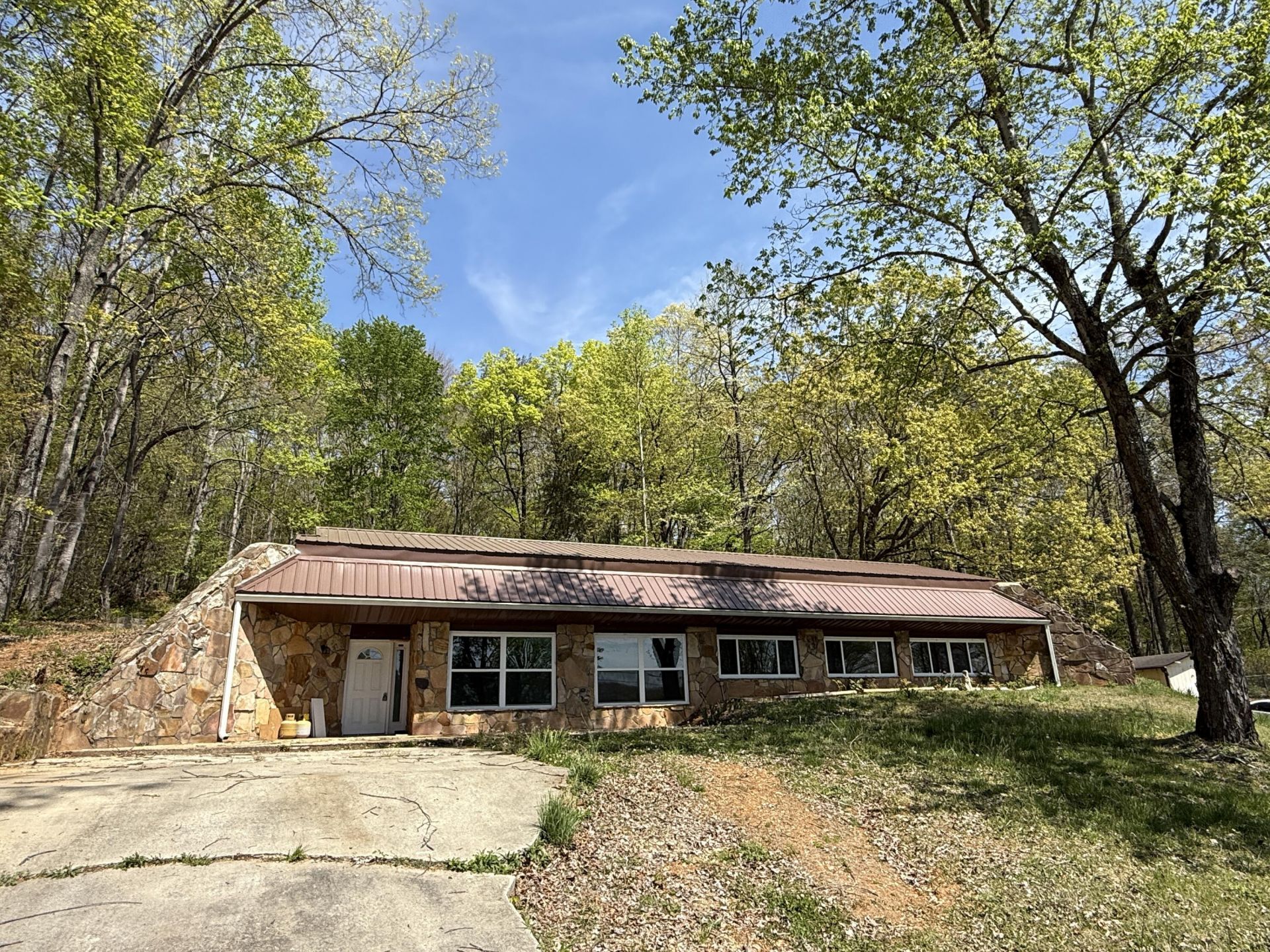 This is truly a unique find!! Energy savings? Yes I think so. Part of the home is underground. All bedrooms are in the front of the house to accommodate windows in the bedrooms. Very well thought out house. Newer roof, super nice, fresh paint, windows, and much more. Lovely stone work. Additional storage behind the house. Loads of space 1444 sq ft, 3 Bedroom 2 full baths. Satisfy your curiosity and check this home out before someone snatches it up!! Seller can assist with appliances.Buyer to verify property lines. Aerial photos and tax maps are not guaranteed.